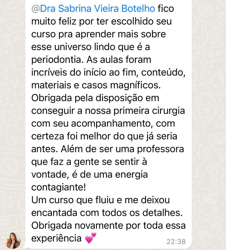 Em 2016 iniciou sua residência em Periodontia, pela UEM, com dedicação exclusiva durante dois anos, e hoje, atua como Professora da Imersão GENGIVO[PLASTIA] e como Periodontista clínica em São Paulo.